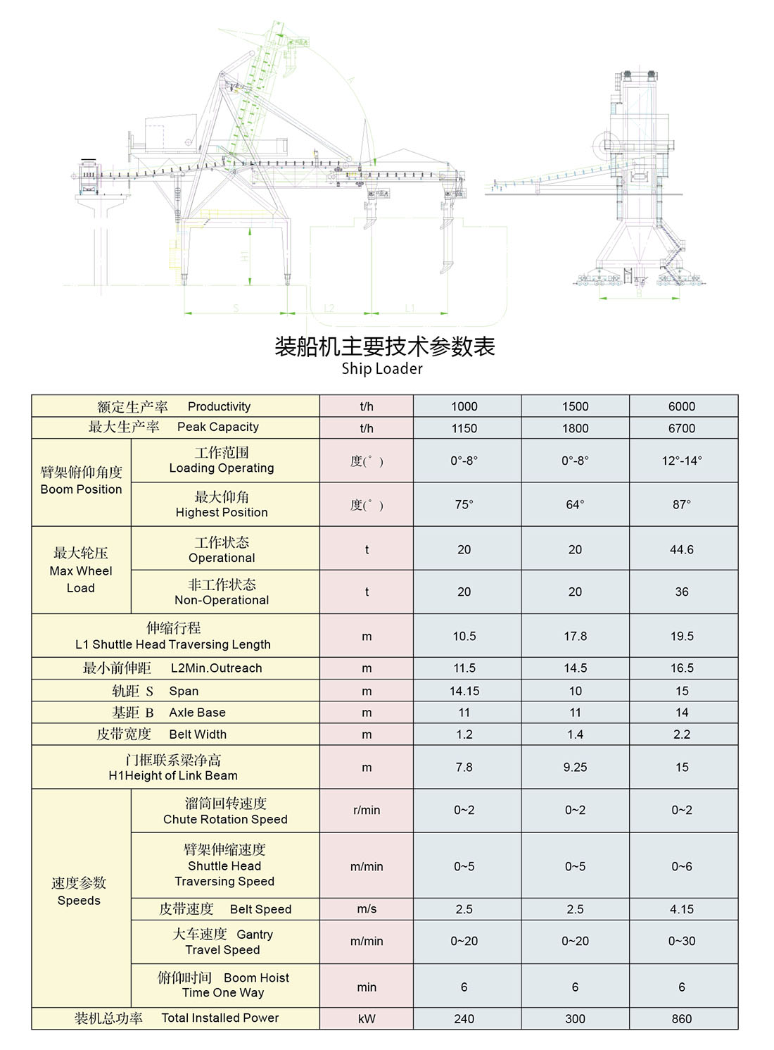 散货由岸边的带式输送机转入装船机的带式输送机,运至悬臂前端经溜筒装入船舱,结构紧凑、布局方便、性能可靠、连续高效