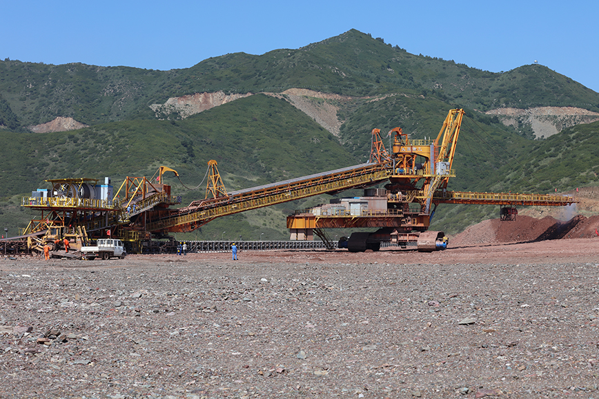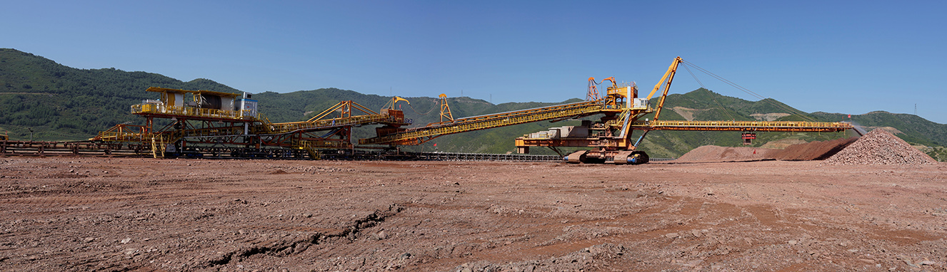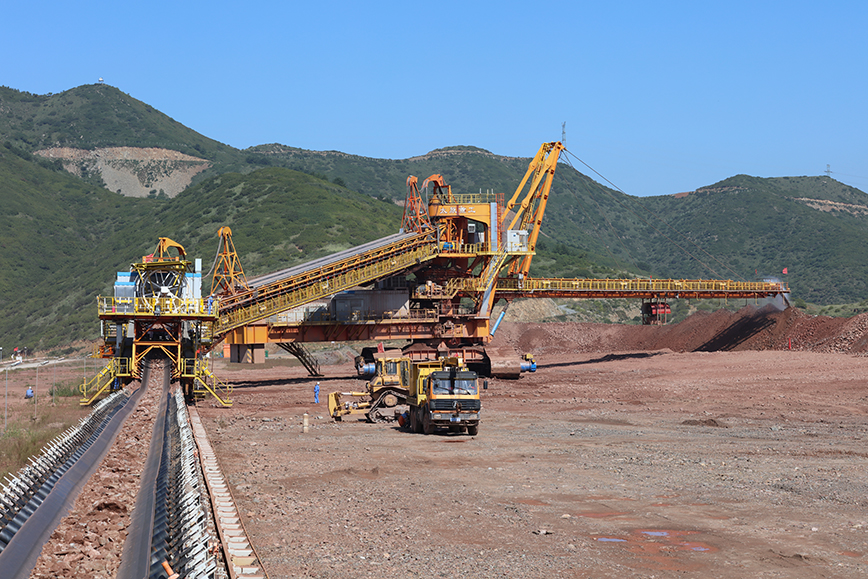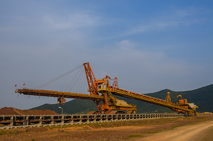 排土机位于大型露天矿山半连续开采系统的末端,用于运输和排弃物料。排土机与卸料车协同工作:卸料车完成物料的提升,将物料传送至排土机的受料皮带上,排土机将卸料车输送来的物料通过排料臂有序排弃至排土场;排土机与卸料车互锁联动完成排土作业。排土机按照排土工艺随排土场的推进而移动。