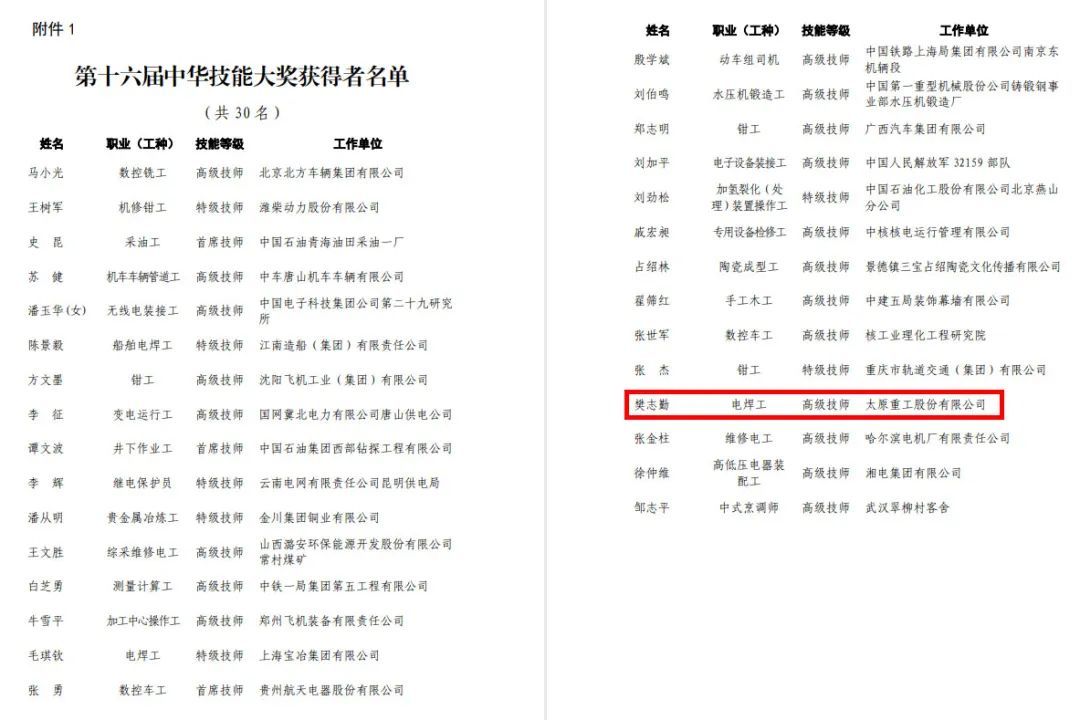 近日,第十六届“中华技能大奖”和“全国技术能手”名单出炉!全国仅30名中华技能大奖获得者,太重集团高级技师樊志勤榜上有名,也是获此殊荣的第一位太重人!衷心祝贺喜获殊荣!