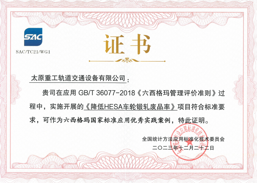 近日,由太重轨道公司完成的《降低HESA车轮锻轧废品率》管理项目,荣获六西格玛国家标准应用优秀实践案例。此奖项由全国统计方法应用标准化技术委员会授予,并在精益六西格玛方法及其应用工作组2023年年会暨精益六西格玛管理国家标准应用案例经验交流会上,对太重进行了表彰。