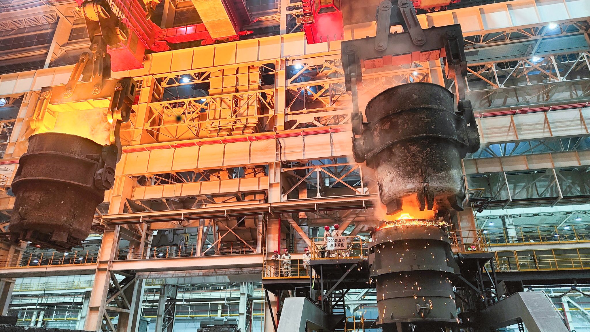 厉兵秣马、尽锐出击。对外采合金精准复验,对内精选400吨钢料,源头把控材料成分;电炉冶炼过程,对钢料再次提纯,钢水纯净度内控标准高于产品技术要求;精炼炉冶炼过程,对温度、成分反偏析控制,确保钢水高质量产出;浇注过程,对多包浇注之间的时间精准把控,320吨天车操作时间差控制在3分钟以内,气体衔接控制在30秒以内,实现最高标准操作;对100多个关键工序连续“复制”3次,连续冶炼3炉超纯净钢水,最终顺利完成240吨钢锭的浇注生产。