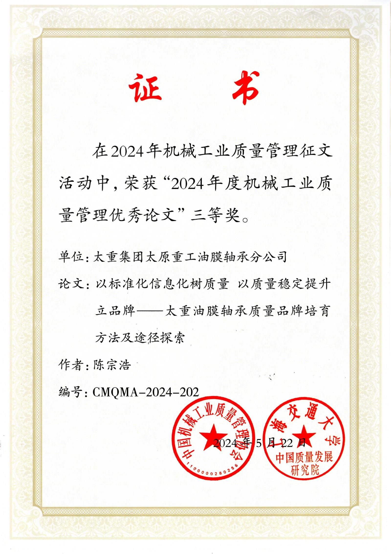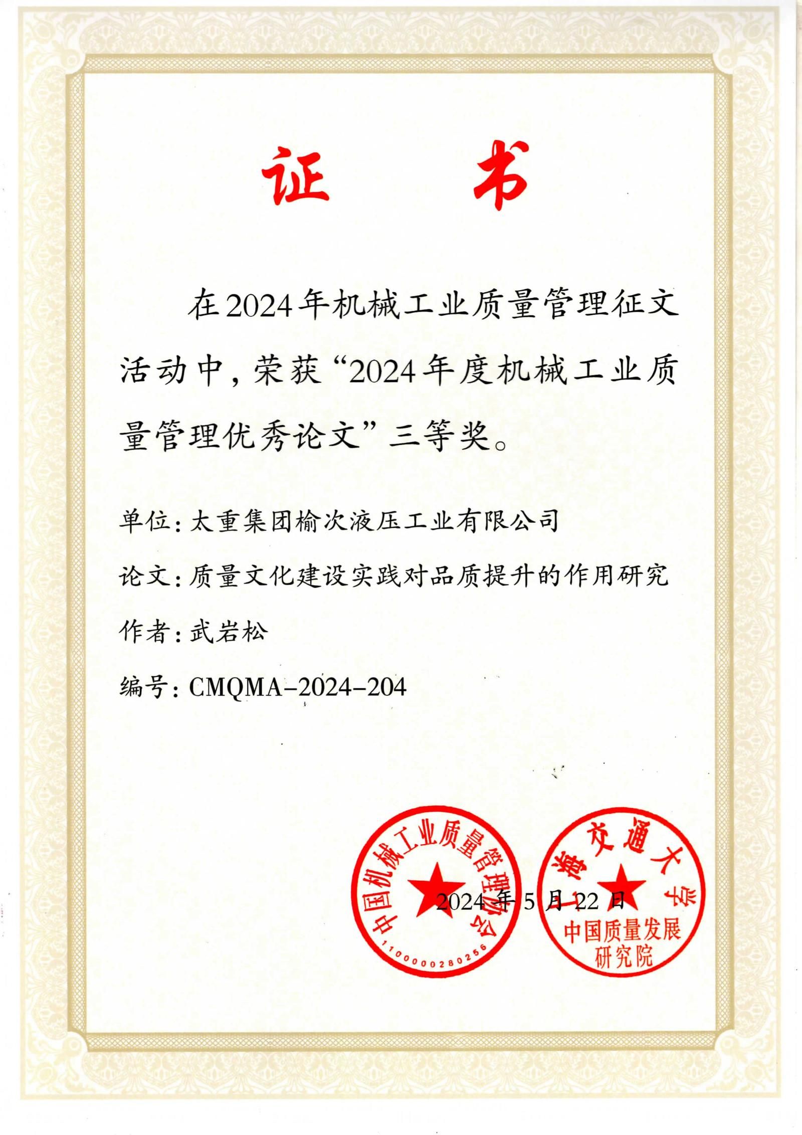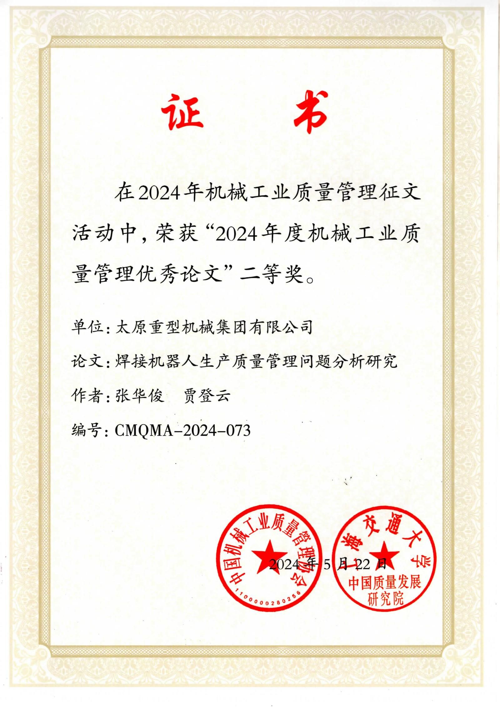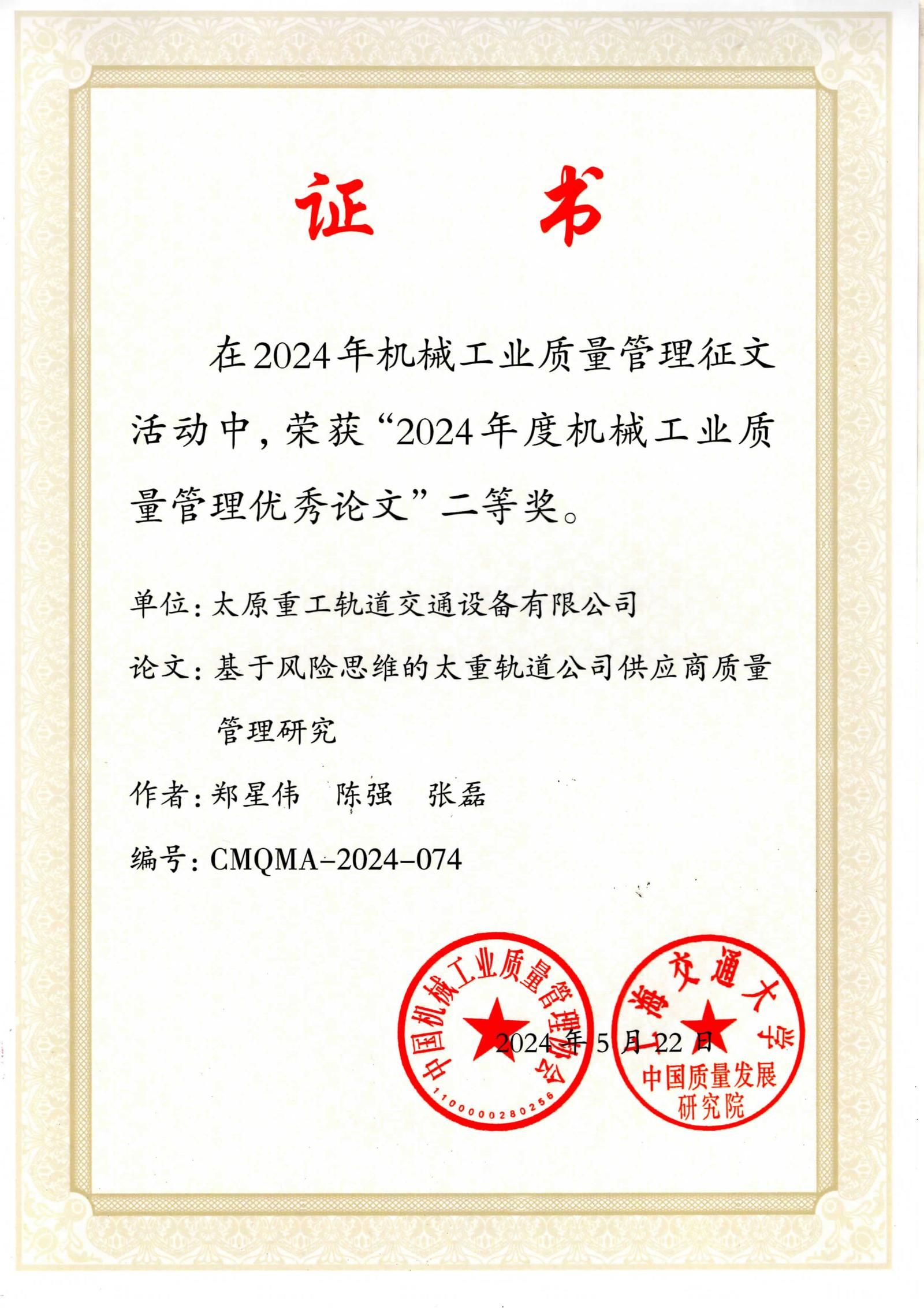 近日,中国机械工业质量管理协会与上海交通大学中国质量发展研究院联合发布了“关于表彰机械工业质量管理优秀论文的决定”。在这次备受关注的评选中,太重集团凭借卓越的质量管理研究与实践成果,荣获3项二等奖和4项三等奖。