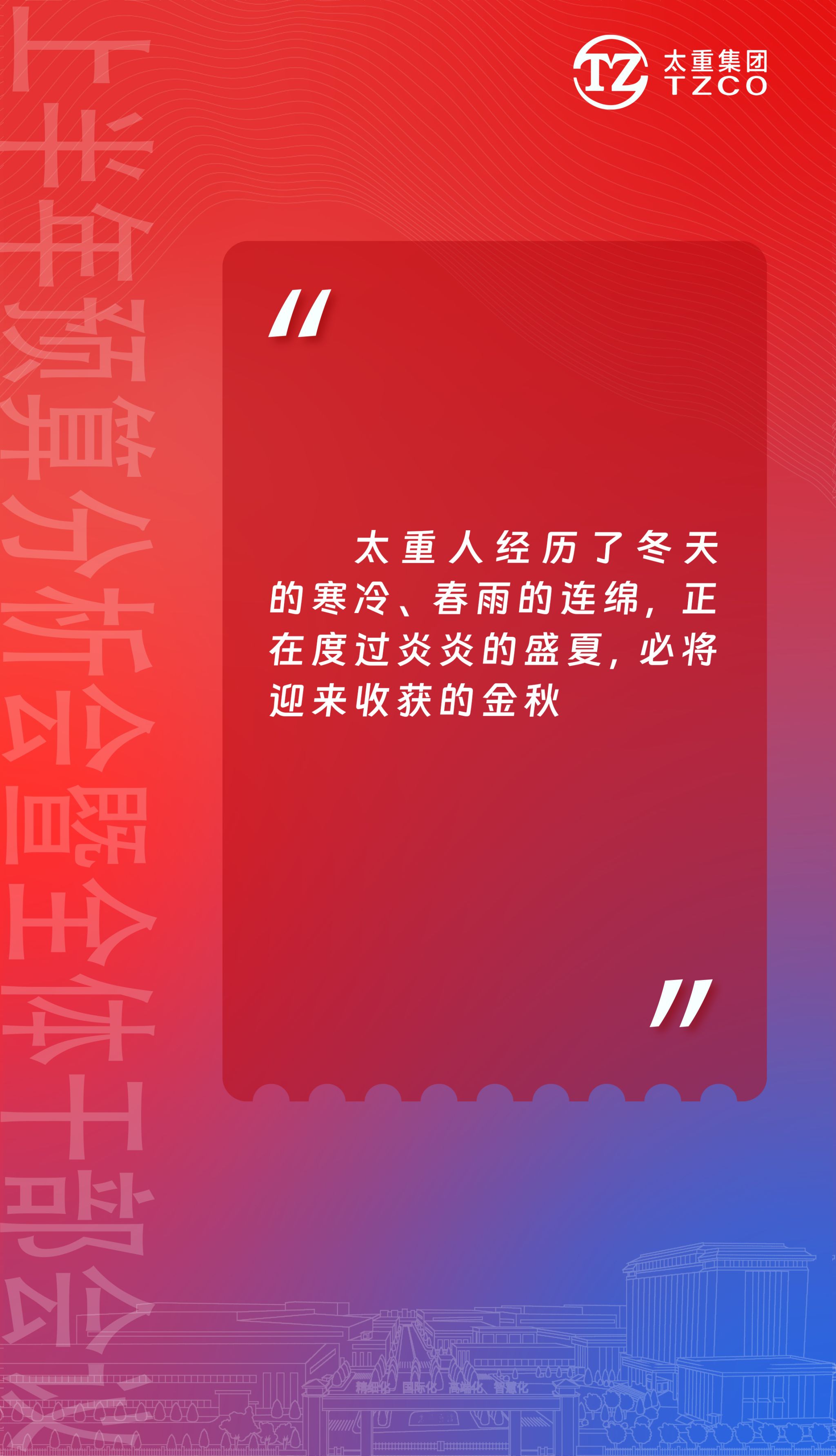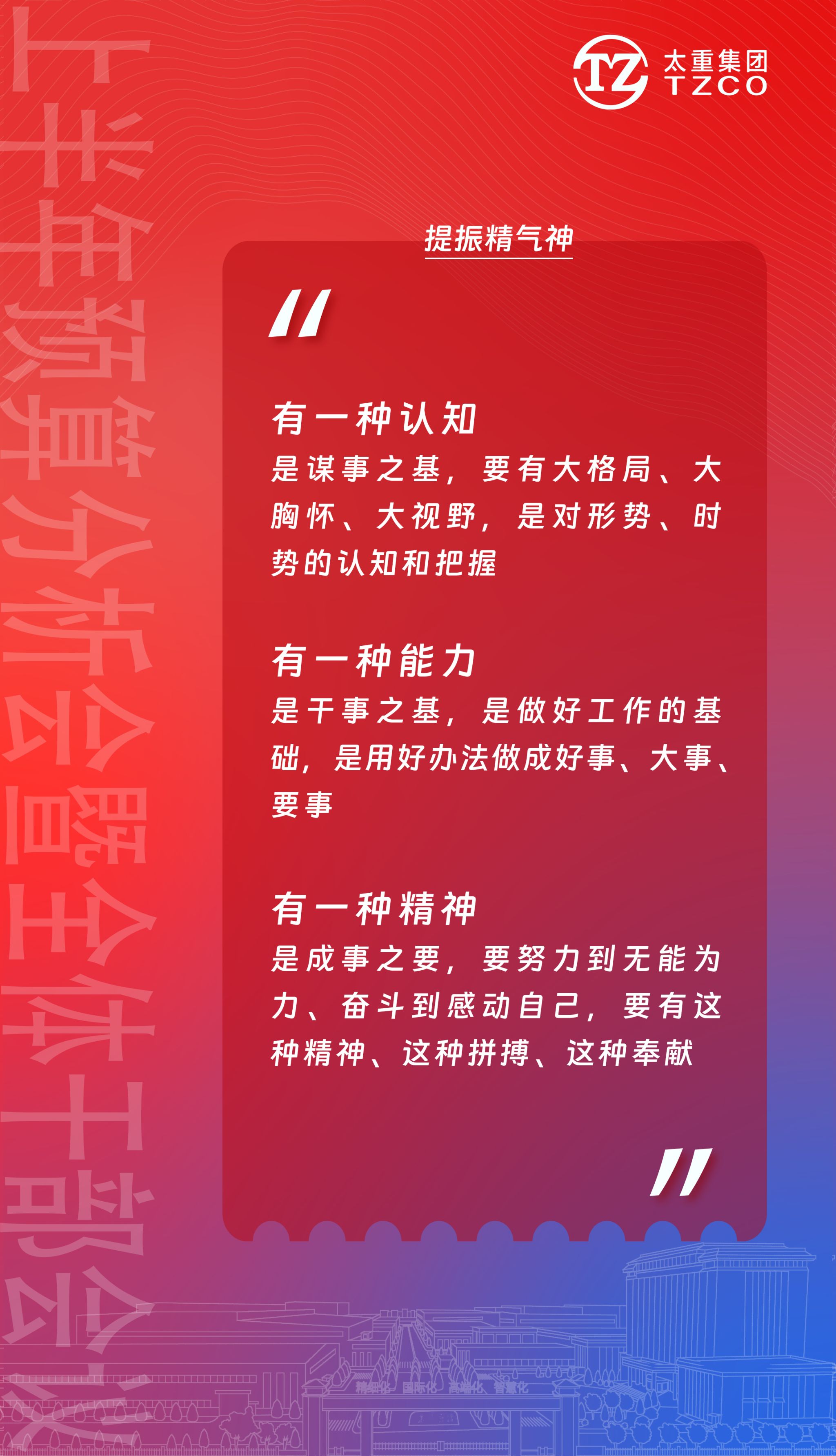 在建设新太重的伟大征程中,要有“舍我其谁”的魄力、有“必定成功”的信心、有“咬定青山不放松”的韧劲。