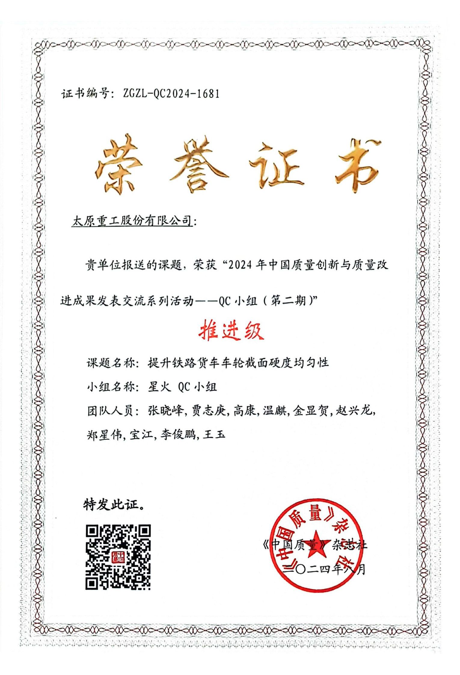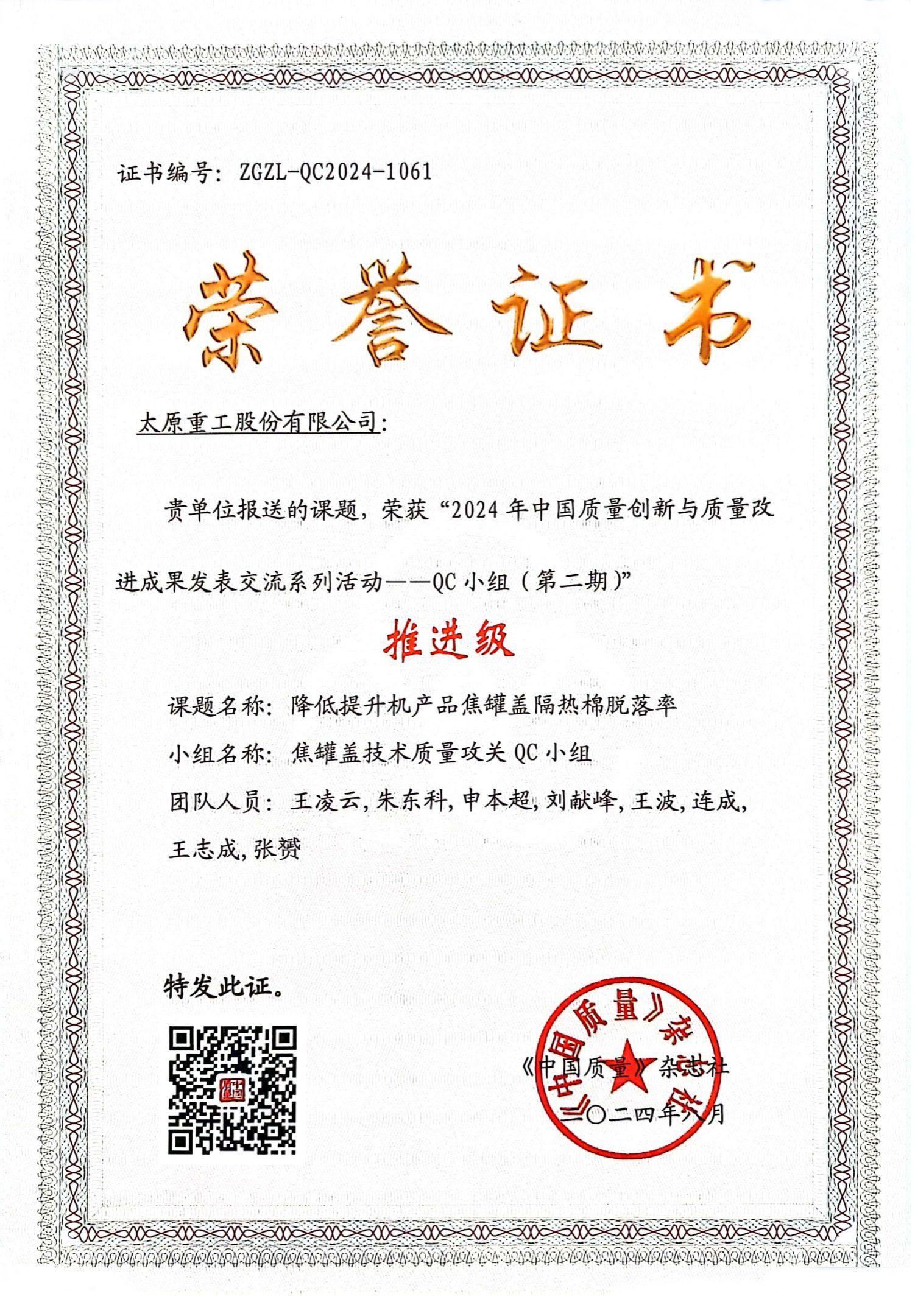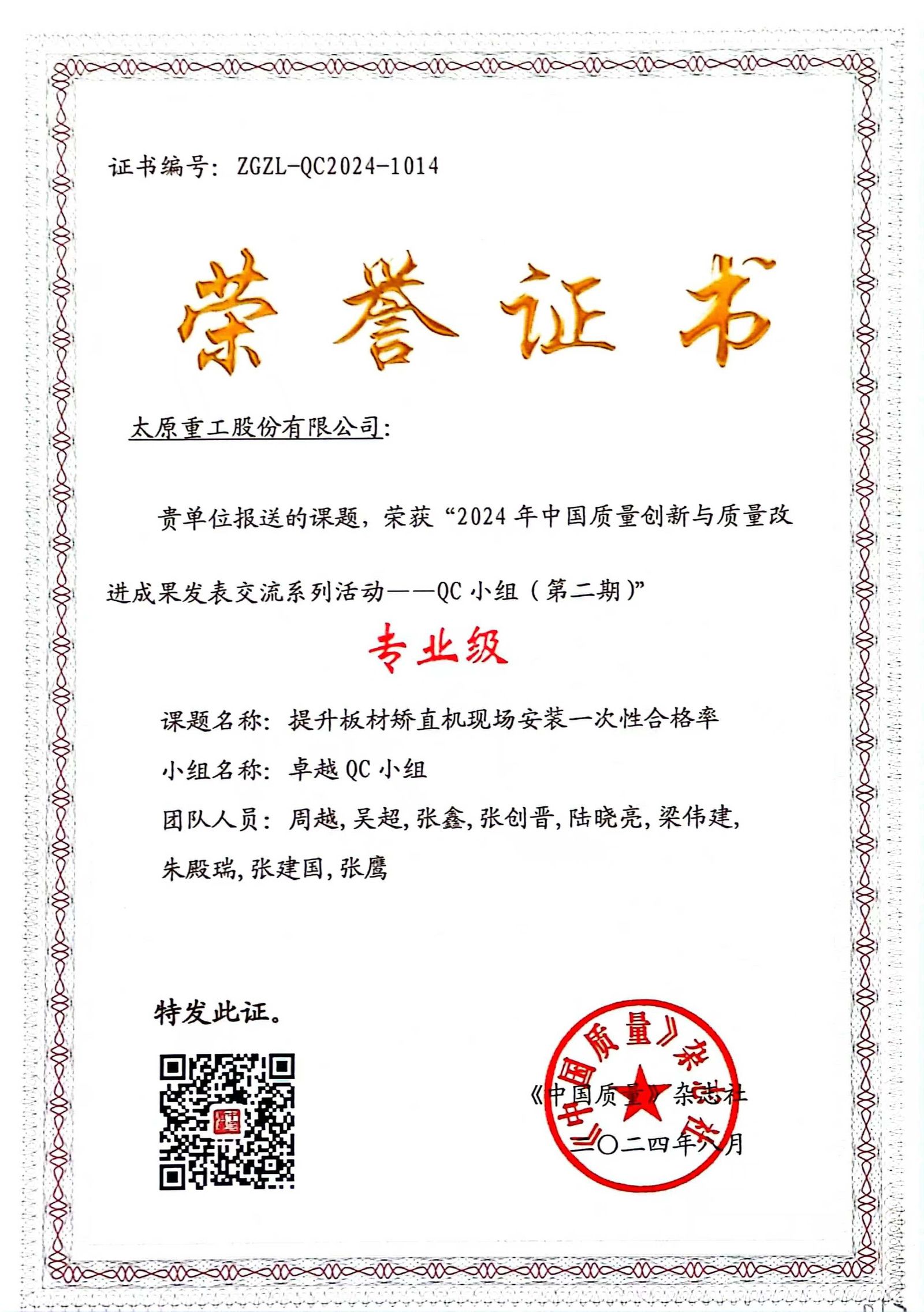 活动中,《提升板材矫直机现场安装一次性合格率》课题获评专业级,《降低提升机产品焦罐盖隔热棉脱落率》《提升铁路货车车轮截面硬度均匀性》两个课题获评推进级。此次全国QC小组成果发表交流活动共有1072个项目参评,设置“示范级”、“专业级”、“推进级”三个级别的奖项,代表了全国QC成果的最高水平。从六西格玛到QC小组,太重质量创新成果屡次获得国家级大奖的背后,凝聚了公司质量工作者向“新”而行、以“质”致远的不懈追求,展示出公司坚持把质量视为企业“生命线”、狠抓质量管理提升的卓越成果。专业级奖项