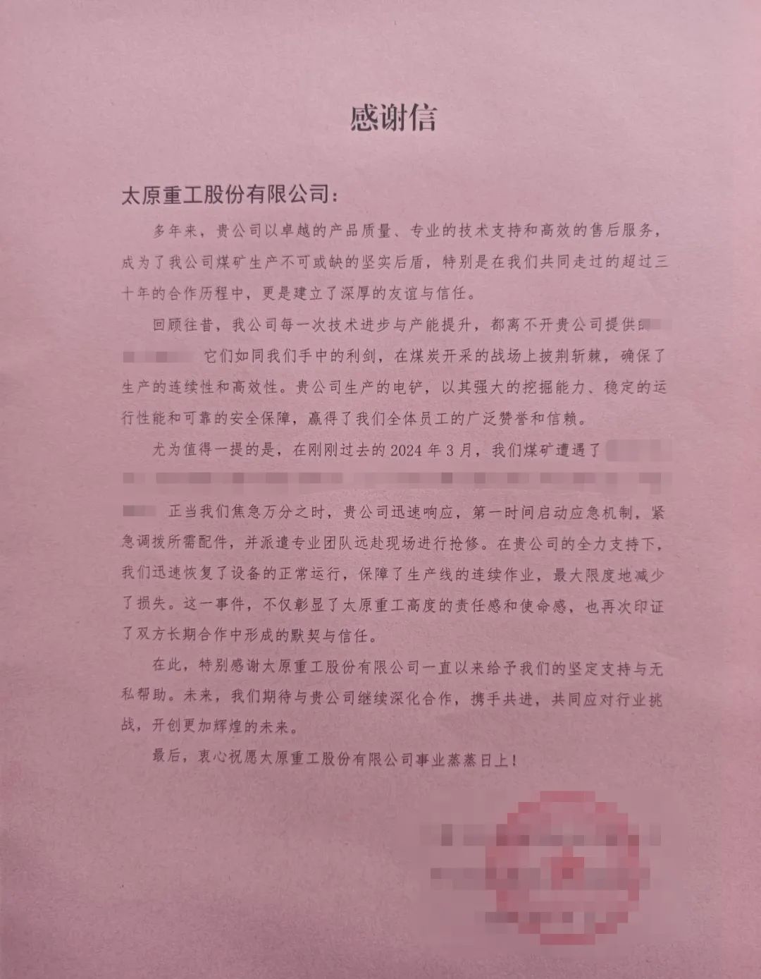 近日,太重收到一封来自合作三十多年内蒙古用户的感谢信,公司以精湛的制造工艺、卓越的产品性能以及贴心的售后服务,赢得用户高度认可,成为用户不可或缺的合作伙伴。