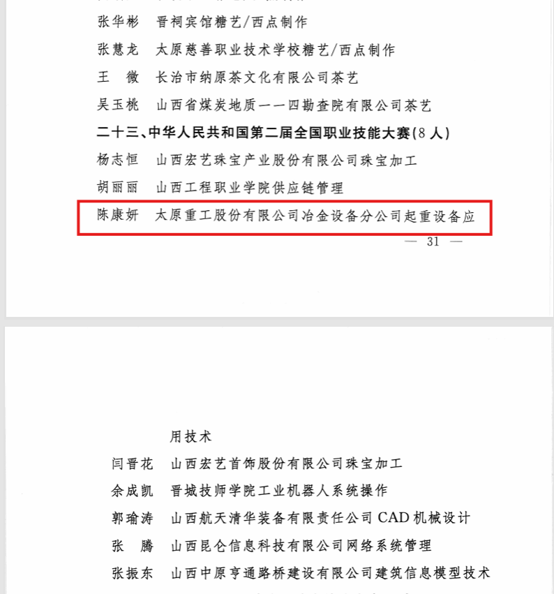近日,山西省人民政府印发《关于授予2022—2023年度职业技能竞赛优秀选手“三晋技术能手”称号的决定》,来自太重冶金设备分公司的行车工陈康妍榜上有名!