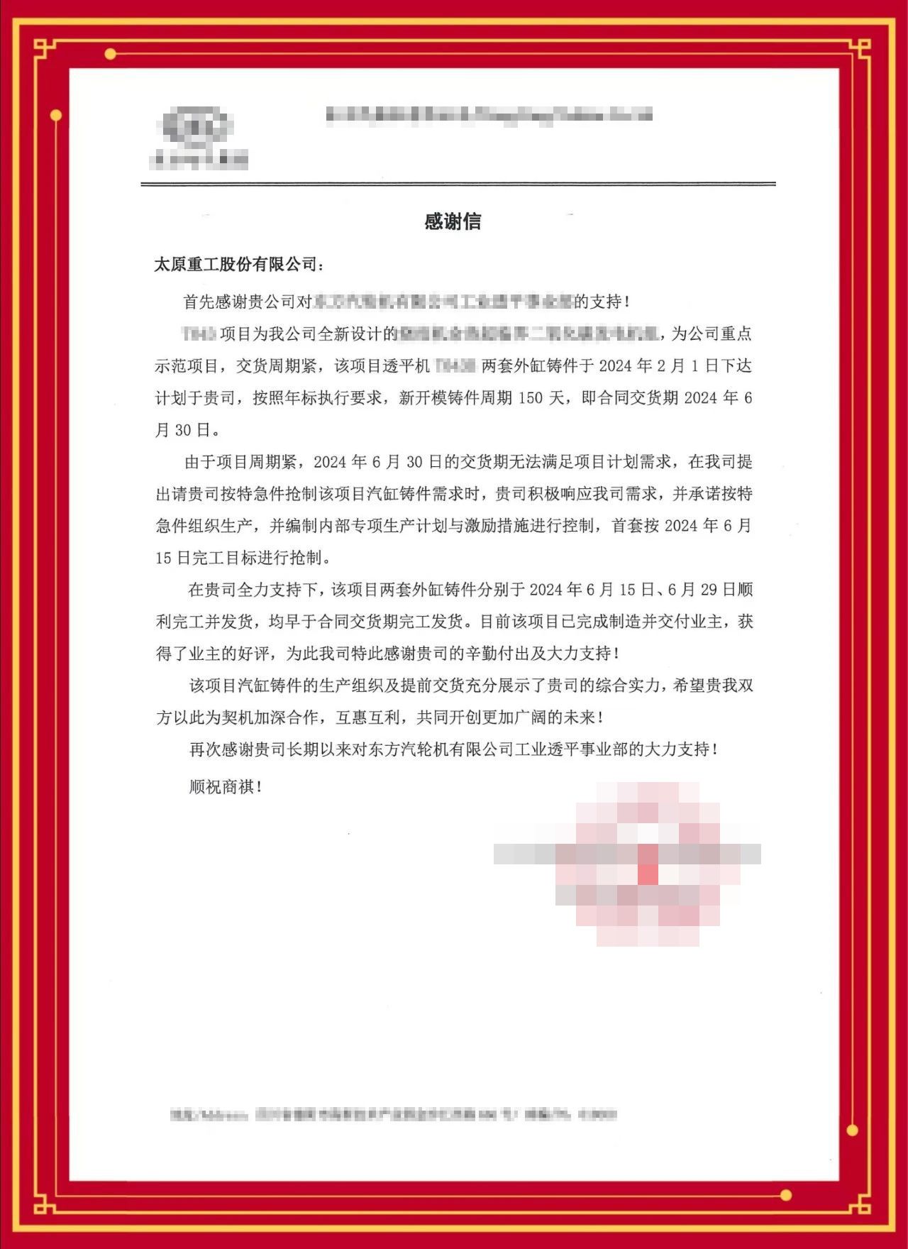 用户的标准就是我们的标准,用户的要求就是我们的追求,用户的利益就是我们的利益。感谢信中字里行间的肯定,是对分公司全体职工长期以来辛勤付出与不懈努力的最好回馈。未来,公司将矢志不渝提升产品质量与服务标准,力求以更加出色、可靠的产品和服务,努力成为用户心中首选的、最值得信赖的合作伙伴。