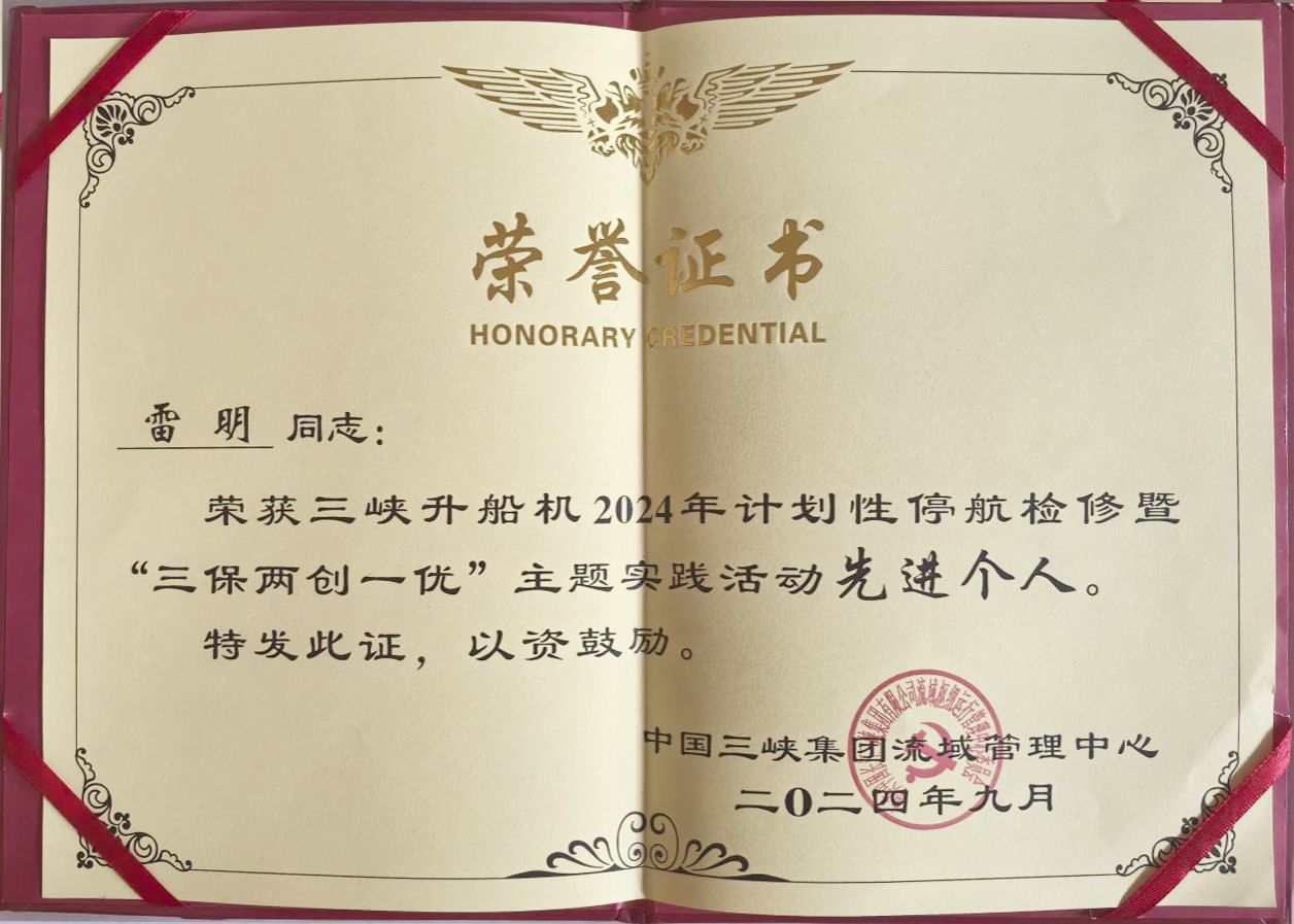 在三峡升船机2024年计划性停航检修项目总结大会上,公司服务人员雷明被评为“先进个人”称号。这是他在2023年获得用户表彰后,连续第二年斩获此项荣誉!争分夺秒保工期,不遗余力赶进度。本次检修是三峡升船机通航以来的第四次停航检修,为期35天,工期紧、任务重、难度高、风险大,为确保如期完成检修任务,太重榆液精心组织、周密安排,积极做好人员、检修工器具、材料及设备设施等各项准备工作,针对本次检修的重难点制定了切实可行的专项施工方案和安全方案。在施工过程中,公司合理组织调配资源,落实技术细节要求,圆满高效地完成了各项检修任务,质量、安全、进度均达到要求,“太重速度”为我国三峡项目的平稳运行再立新功!