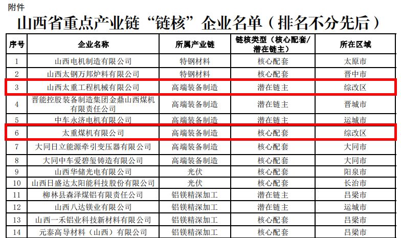 近日,在山西省工业和信息化厅最新发布的关于山西省重点产业链“链核”企业名单中,山西太重工程机械有限公司与太重煤机有限公司分别入选高端装备制造“潜在链主”与“核心配套”企业,彰显了太重在产业链建设上的强大实力。