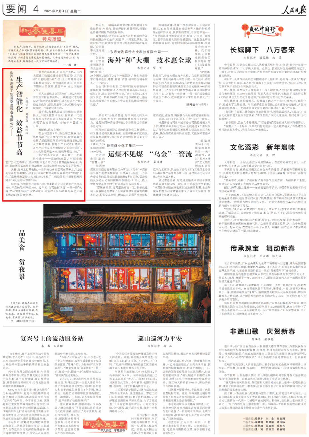 新春伊始,万象更新,太重以亮眼开局备受瞩目,荣登媒体热榜。生产智能化、效益节节高!2月4日,人民日报《新春走基层·特别报道》走进轨道交通行业首座“灯塔工厂”——太重轨道公司车轮厂二线,感受智能化生产的澎湃脉动。数据见证非凡成就:劳动生产率提高43%,产品缺陷率降低33%,营业收入从2017年的18亿元增长到2024年的30亿元,清晰勾勒出太重向智能化大步迈进、效益持续上扬的坚实步伐。2月5日,山西新闻联播《节后上班首日 我省各地奋进“春天里”》栏目也将镜头对准太重工程时时彩项目建设现场,工人们忙碌而有序,大型机械轰鸣作响,努力打造高端装备制造双链双千亿产业集群,彰显太重人奋进争先的蓬勃朝气与豪迈干劲!春启新程,开局冲刺!2025,让我们以奋斗之名,携手共进,续写太重新的辉煌!