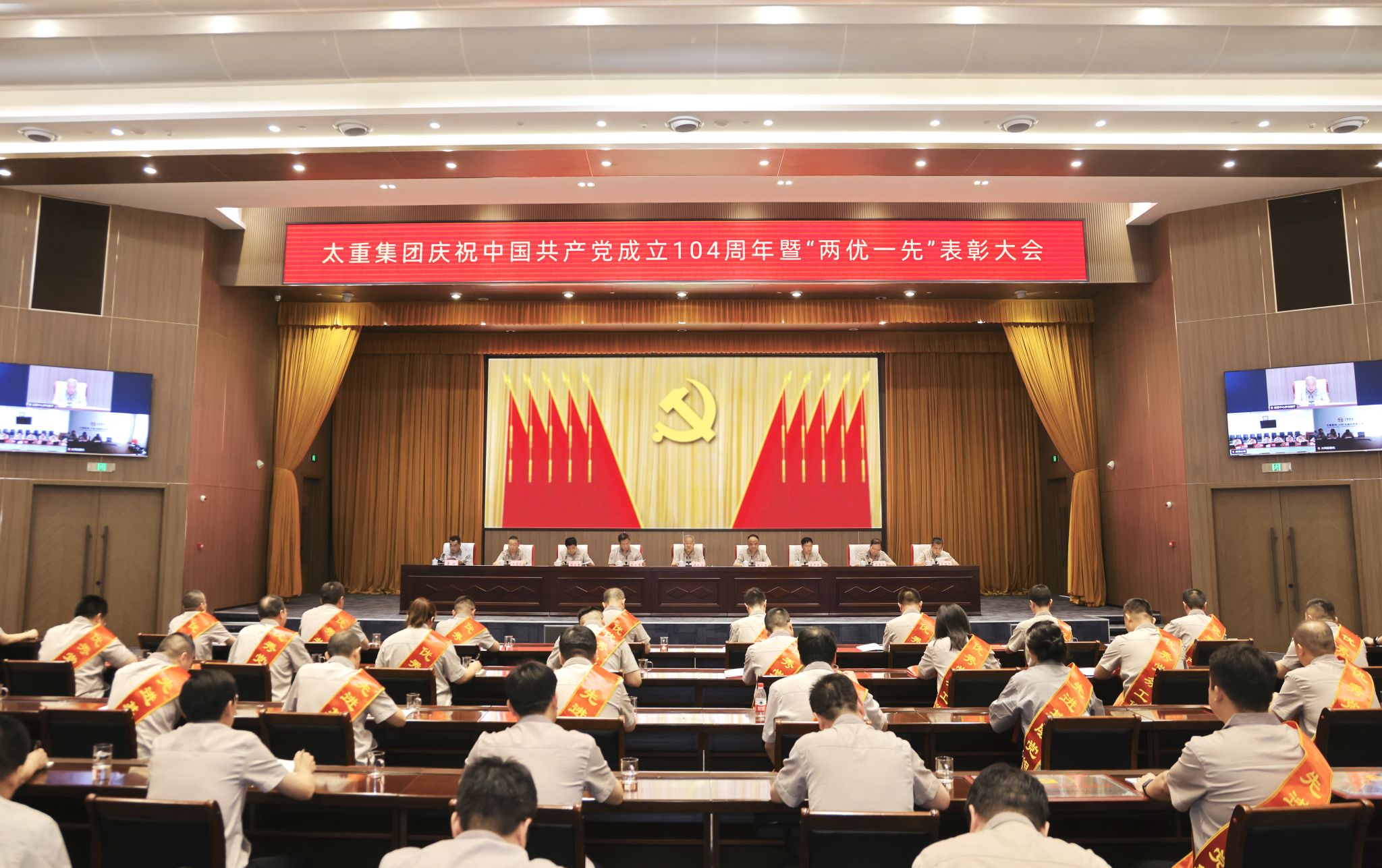 党徽熠熠生辉,旗帜鲜艳似火,大会在庄严的国歌声中拉开帷幕。集团公司党委副书记、副董事长、总经理陶家晋主持会议。公司党委专职副书记、副董事长张新伟宣读集团公司党委《关于表彰优秀共产党员、优秀党务工作者和先进基层党组织的决定》。“两优一先”代表们身披绶带、胸佩红花依次登台,公司领导为他们颁奖。
