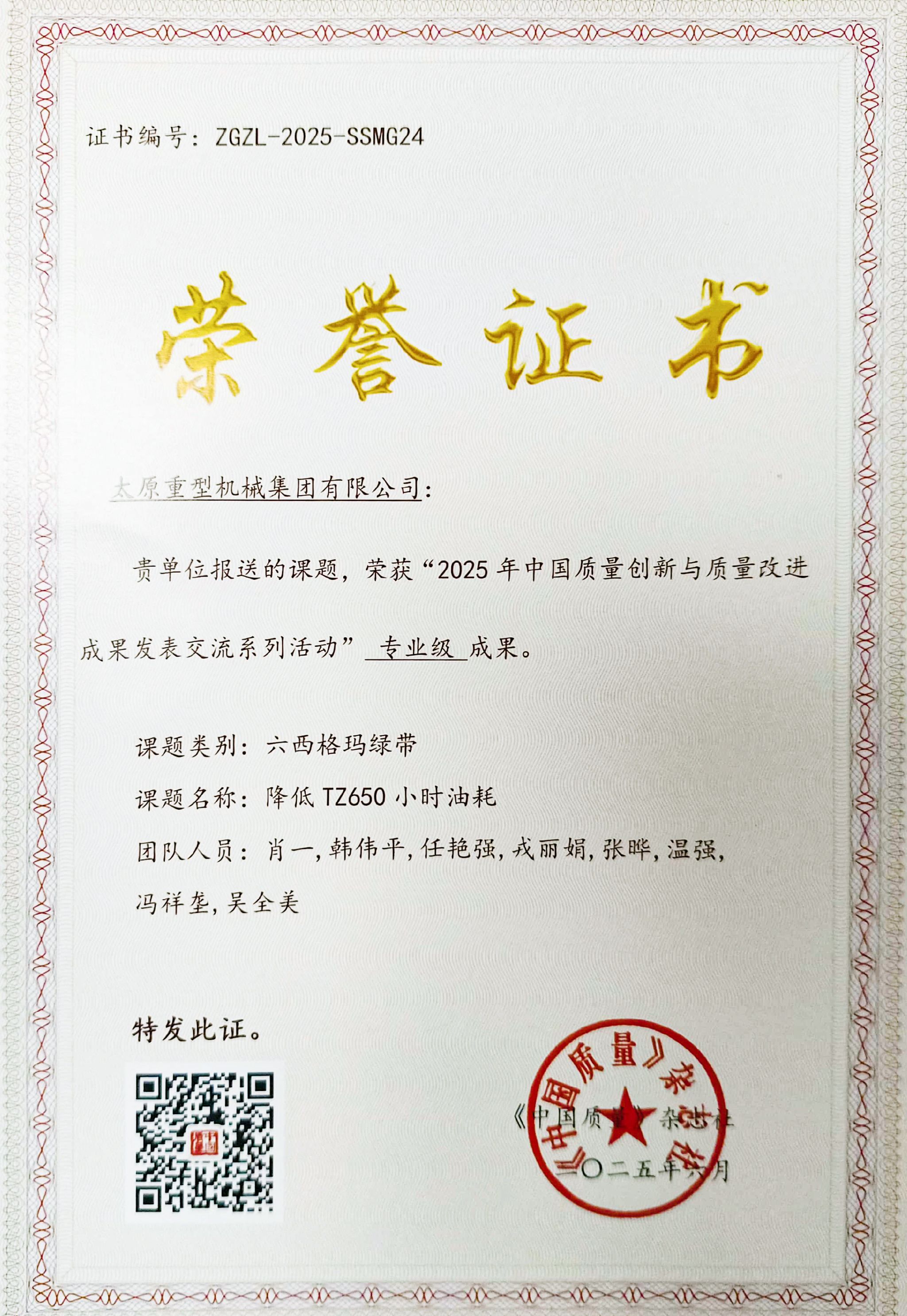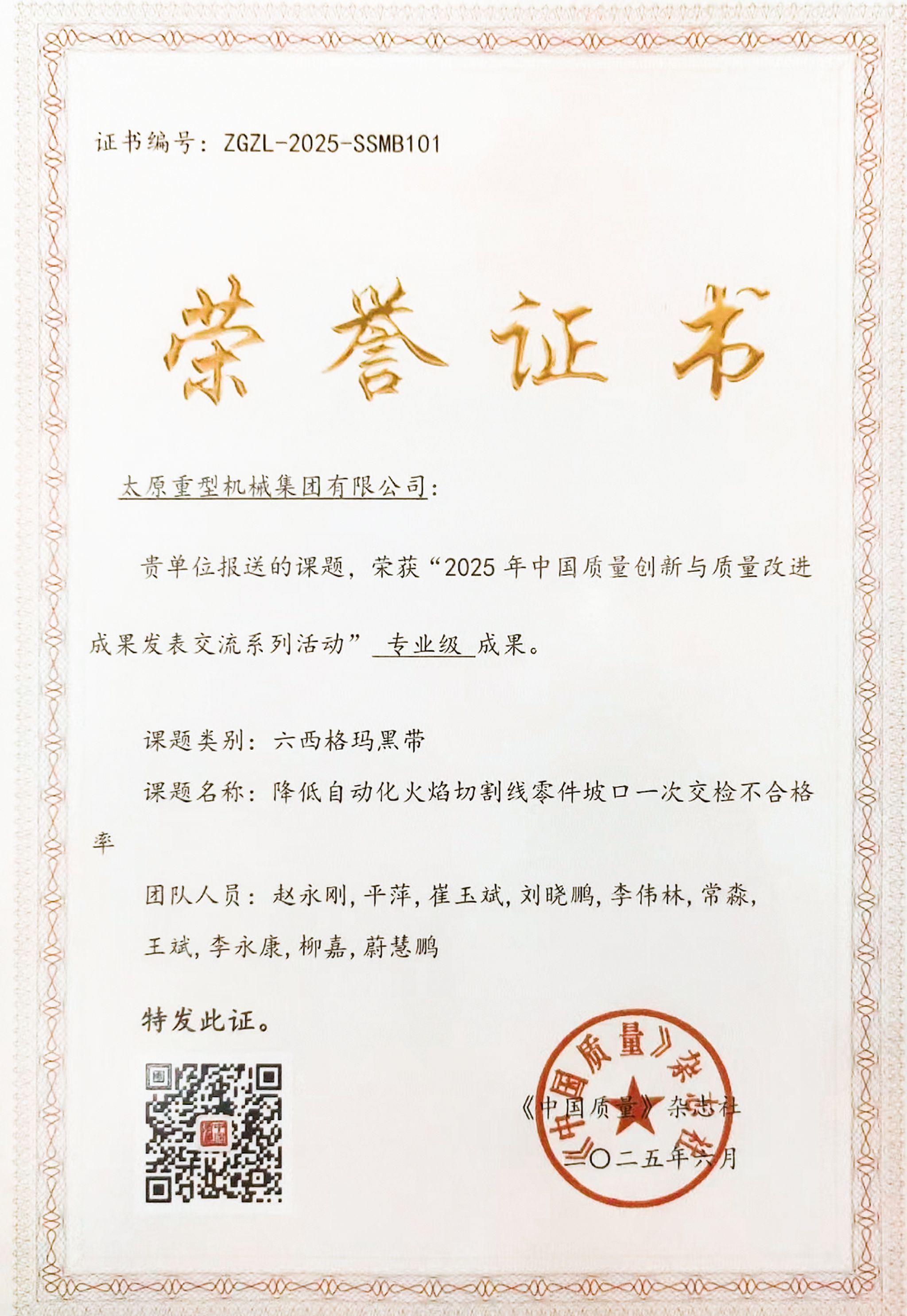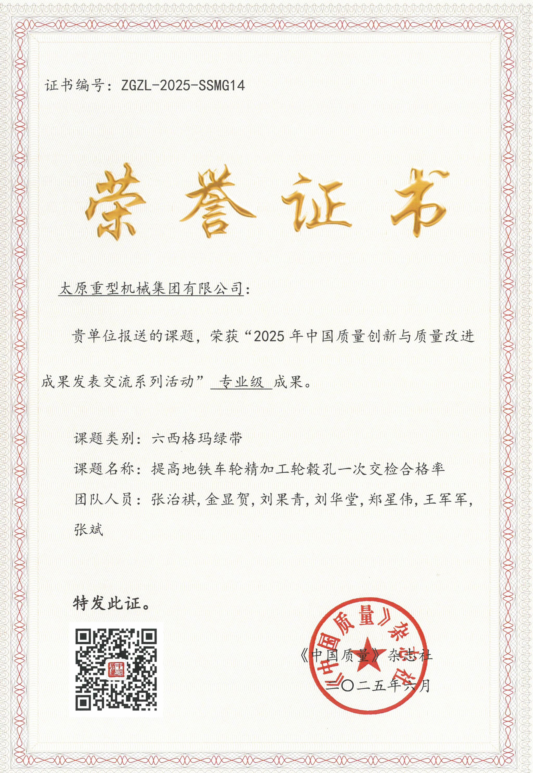 这份成绩源自持续的质量管理投入。在中国质量协会《中国质量》杂志社组织的“2025年中国质量创新与质量改进成果发表交流系列活动”中,太重报送的6项六西格玛成果凭借突出的技术创新性和实际效益脱颖而出,成功斩获“示范级”“专业级”成果奖项,这也是太重连续第二年在该权威活动中荣获奖项。