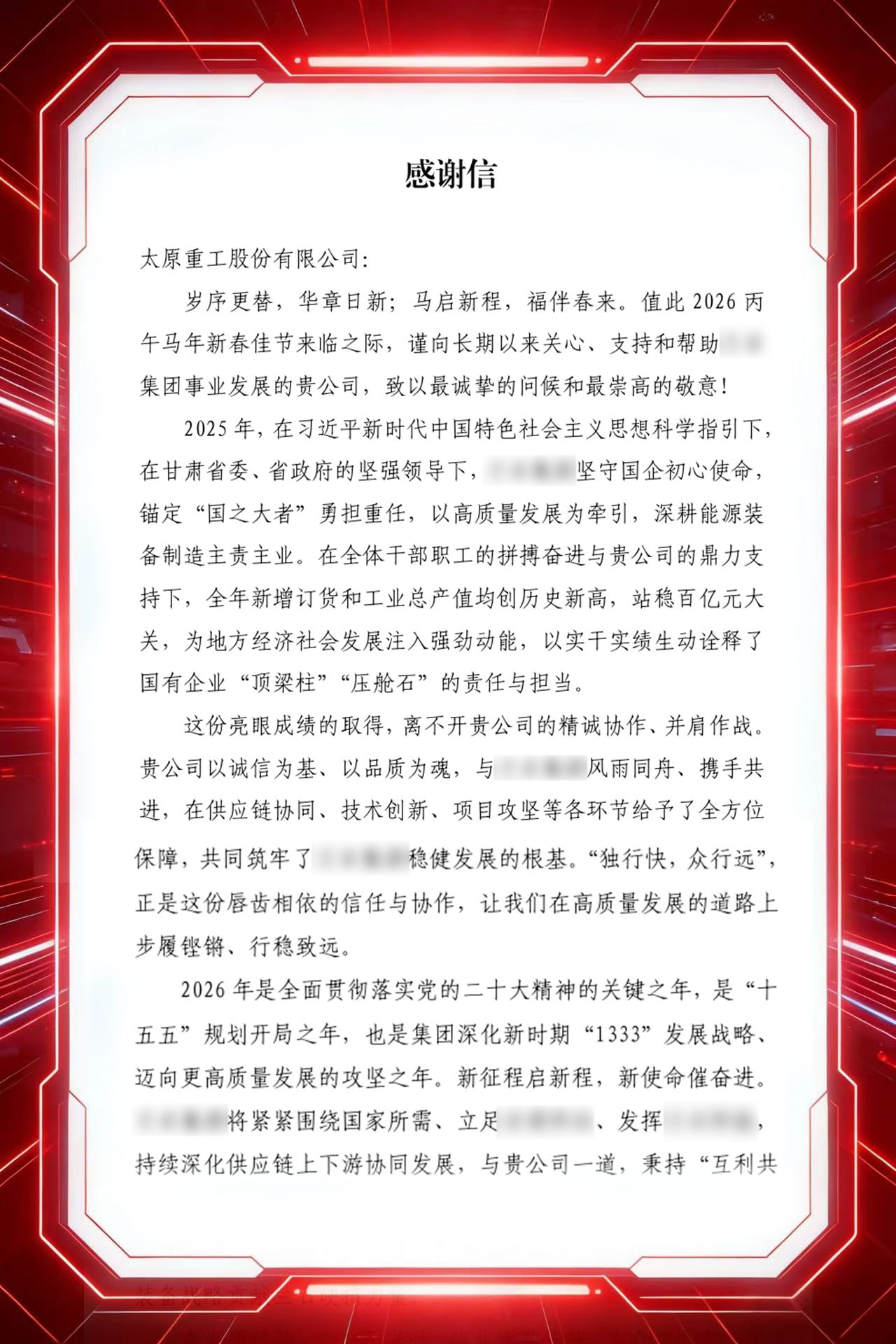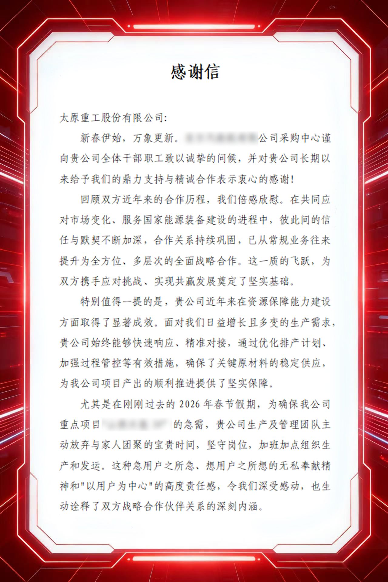 急用户之所急,想用户之所想。这封感谢信,字字句句饱含着用户的诚挚谢意,是铸锻件分公司与用户战略合作共赢成果的有力见证。从常规铸件到800t钢水超大型铸件的攻坚突破,在一次次紧密协作,在一次次高质量交付的考验中,与用户形成了互信互助、携手共进的良好格局,共同为地方重大工程实施和产业高质量发展贡献力量。
