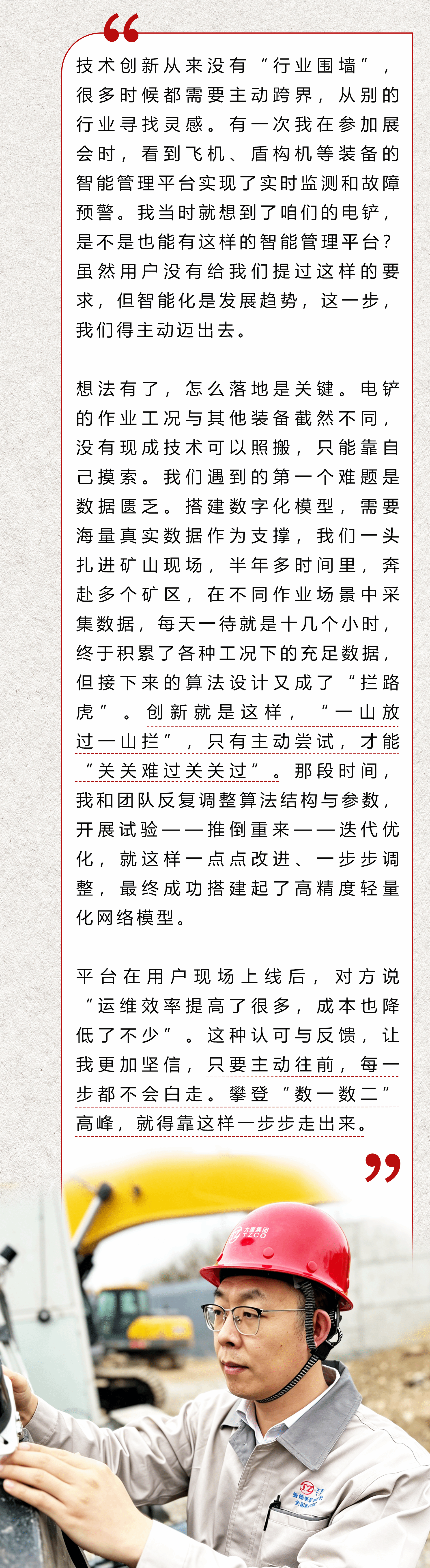 “数一数二”的装备,要有“数一数二”的智慧。在陕西用户露天煤矿,一台太重电铲正挥舞铲斗、灵活转向,高效完成铲装作业;数公里外的智能监控室里,大屏幕上的一台虚拟电铲与现场设备同步动作,宛如“孪生兄弟”,运行数据、健康状况在看板上清晰跳动,让设备实现了“状态一目了然、故障提前预判、运维有的放矢”。这套系统,是国内功能最齐全的电铲故障诊断与健康管理平台,它就诞生于王勇澎和团队成员的手中。