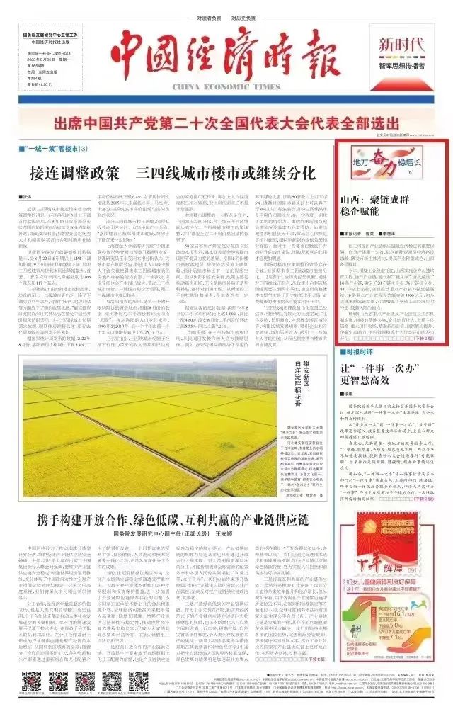今日,中国经济时报头版以《山西:聚链成群 稳企赋能》为题,重点关注太重集团凭借在高端装备制造和风电装备领域的突出优势,成为山西省唯一的“双链主”企业,主动发挥“链主”企业的引领支撑作用,精准延链补链强链,推动形成全省“一企带一链、一链带一片”的产业发展格局。