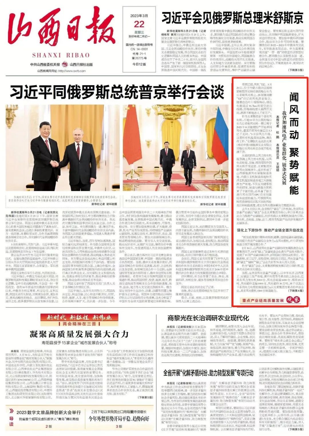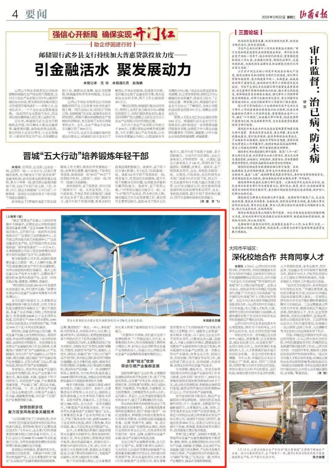 今天,山西日报头版“重点产业链高质量发展观察”专栏,以“我省风电产业集群化、链条式发展”为题,报道了太重集团闻风而动、聚势赋能,发展壮大风电产业链、创新链、价值链的生动实践。