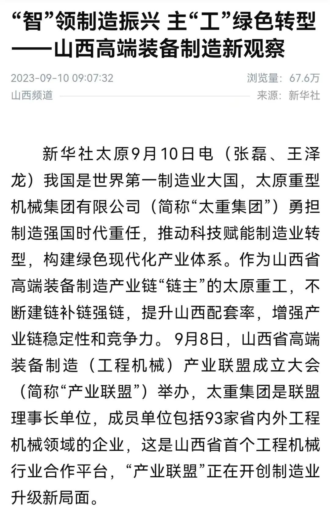 (简称“太重集团”)勇担制造强国时代重任,推动科技赋能制造业转型,构建绿色现代化产业体系。作为山西省高端装备制造产业链“链主”的太重集团,不断建链补链强链,提升山西配套率,增强产业链稳定性和竞争力。9月8日,山西省高端装备制造(工程机械)产业联盟成立大会(简称“产业联盟”)举办,太重集团是联盟理事长单位,成员单位包括93家省内外工程机械领域的企业,这是山西省首个工程机械行业合作平台,“产业联盟”正在开创制造业升级新局面。