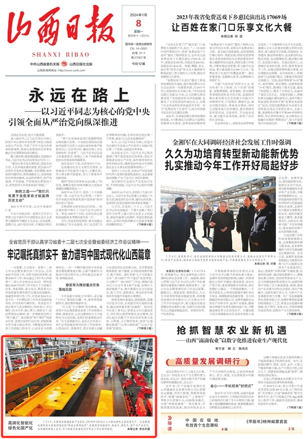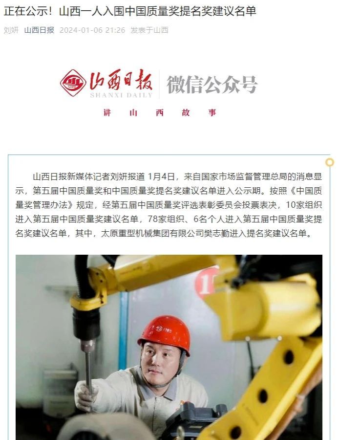新年伊始,太重高质量发展喜讯频传,山西日报重点关注太重集团加快推进新型工业化塑造发展新优势,头版以《高端化智能化 绿色化国产化》为题,报道太重多个智能化时时彩项目和出口项目的火热生产现场。另外,太重职工樊志勤进入第五届中国质量奖提名奖建议名单,为推动建设质量强国,增强质量管理竖立起太重标杆。