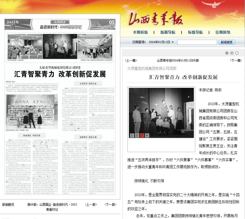 今日,山西青年报以《汇青智聚青力 改革创新促发展》为题,整版从“持续强化 不断引领”“立足岗位 建功立业”“凝聚青年 服务大局”三个方面,对太重共青团2023年工作进行全面报道。