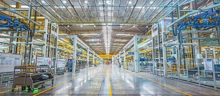 太重智能高端液压挖掘机产业园装配车间,上千个零部件通过空中走廊和地面运输机器人汇聚,平均每4分24秒就能装配完成一台挖掘机。牛帅摄(中经视觉)