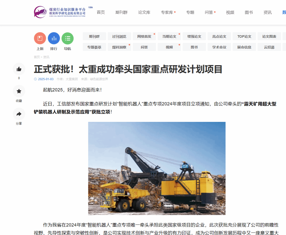 近日,2024年度国家重点研发计划立项结果公布,公司牵头的“露天矿用超大型铲装机器人研制及示范应用”获批立项!