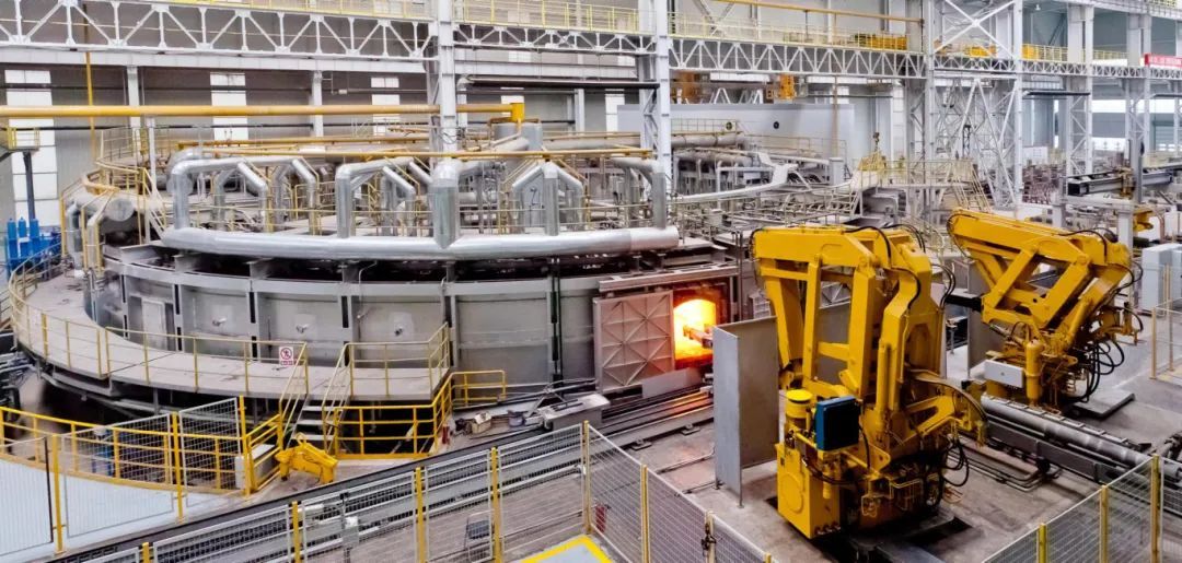 6月20日,轨道公司车轮厂二线上,大型智能环形加热炉正对车轮钢坯进行自动精准加热。