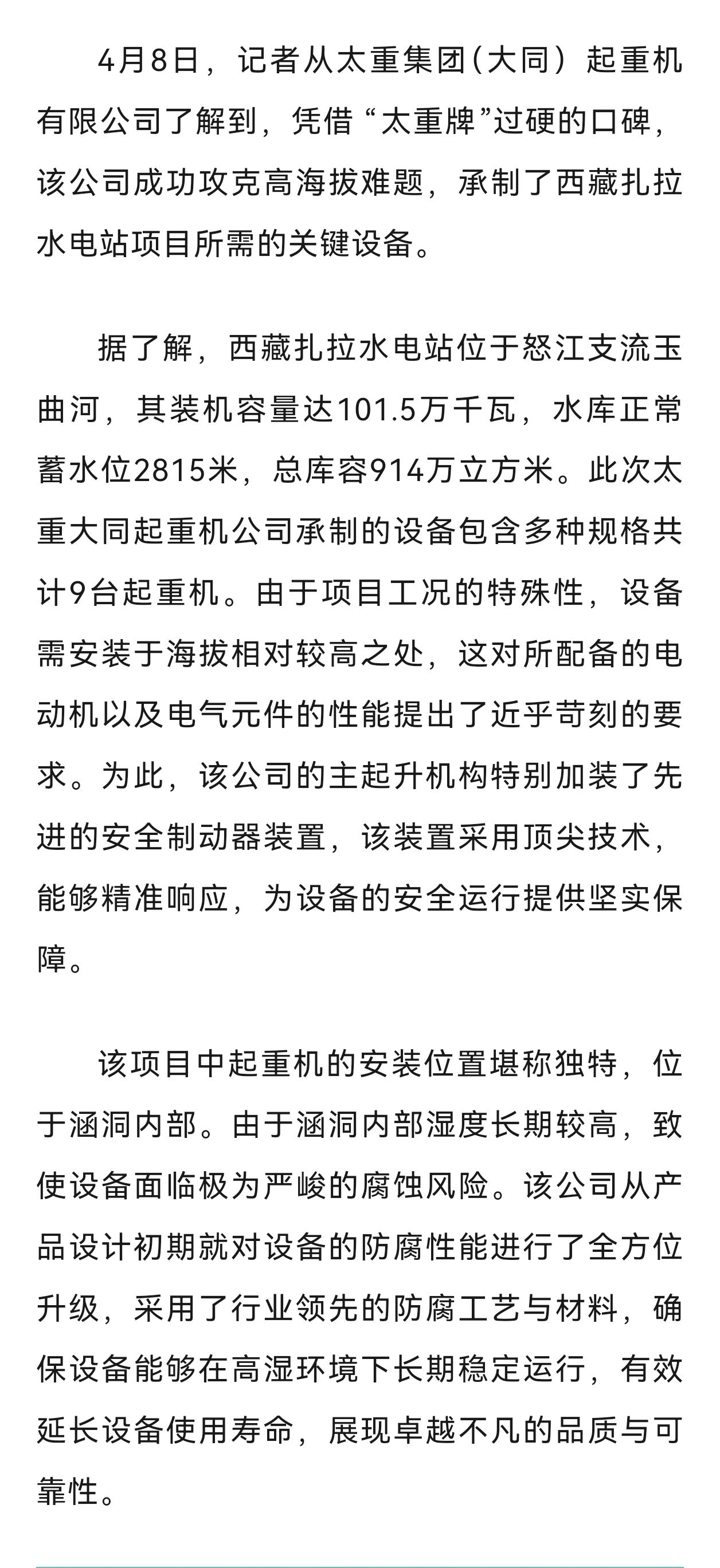 喜讯传来,振奋人心!太重集团(大同)时时彩有限公司佳绩不断,再获瞩目。此前助力攀枝花项目,凭借出色表现受到媒体关注。4月9日,《大同日报》头版再度聚焦报道,太重集团(大同)时时彩有限公司攻克高海拔难题,成功承制了西藏扎拉水电站项目关键设备承制任务。